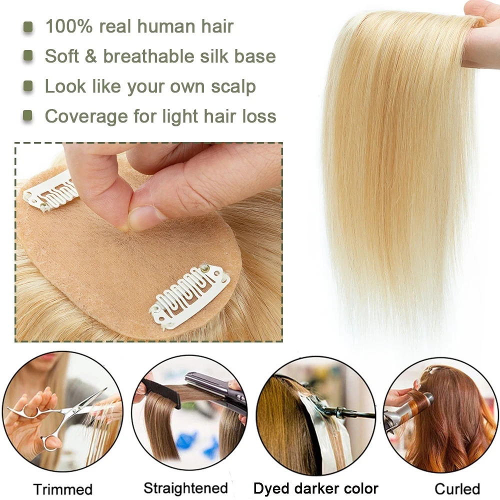 Small Human Hair Topper 2.3''x 3.5'' Silk Base Natural Hair Piece For Women 2 Clips on Hairpiece Invisible Light Topper